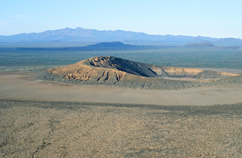 Looking southwest across Cerro Colorado toward the Sierra Pinacate. La Laja cinder cone and its flows, evidently the youngest eruption in the Pinacate, are the dark rocks in the middle distance. Cerro Colorado is a tuff cone whose crater floor is somewhat deeper than the pre-existing ground surface and which is built of tuff consisting of ejected gravel and chilled bits of magma (juvenile ash). A strong north wind (blowing from right to left here) evidently accompanied the cone-building eruptions.