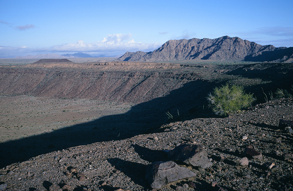 View looking NW from the east rim of MacDougal Crater. The Hornaday Range is in the background. MacDougal Crater was named ssfor Daniel T. MacDougal, botanist on the 1907 Hornaday expedition. The tan beds on the rim of the crater are the ejecta from the maar-forming eruptions.