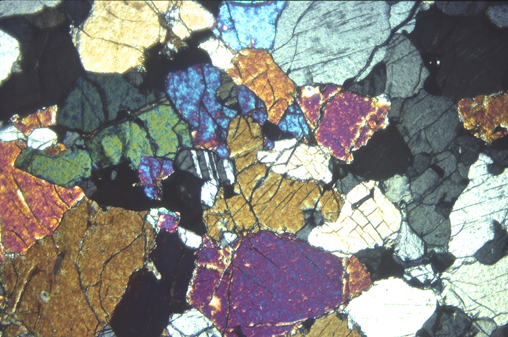 Rare fragments of olivine-rich metamorphic rock were brought to the surface in a few Pinacate eruptions. This microscopic view of an area 4 mm across uses polarized light to illuminate a paper-thin slice of such a fragment that contains five different minerals. The chemistry of these mineral grains indicates that they originated in the earth's mantle about 30 km (18.6 mi.) below the surface, where the temperature is 870° C (about 1600° F). Pinacate lavas originated by partial melting of the mantle, albeit at far greater depth and higher temperature.