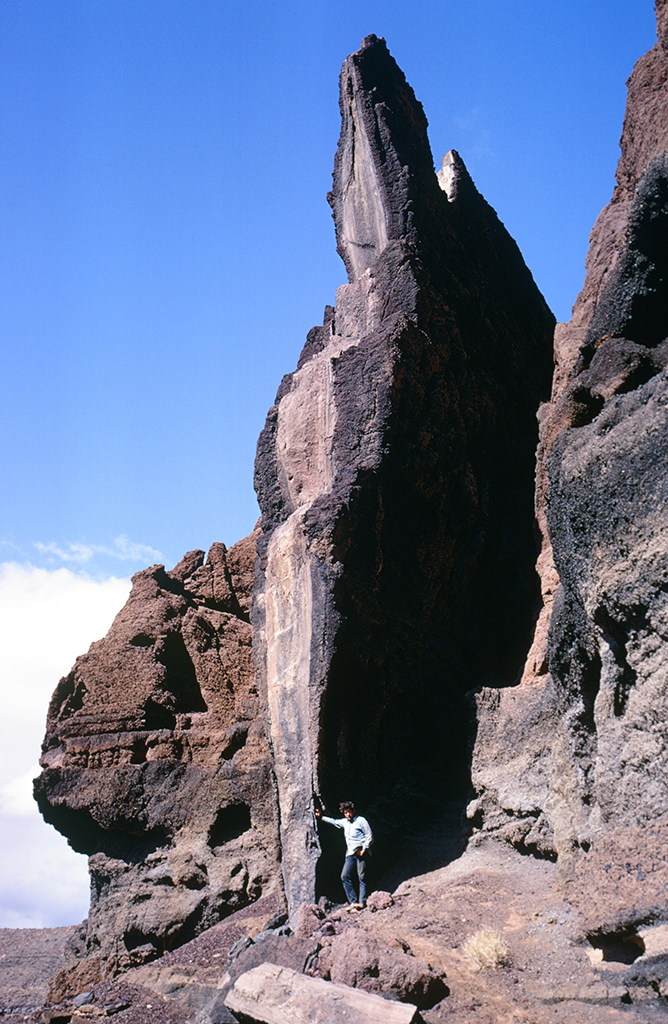 Dike intruded radially outward from the vent in the cinder cone exposed in the walls of Crater Elegante. The crest and keel of the dike are exposed in the cliffs. The crest is horizontal.