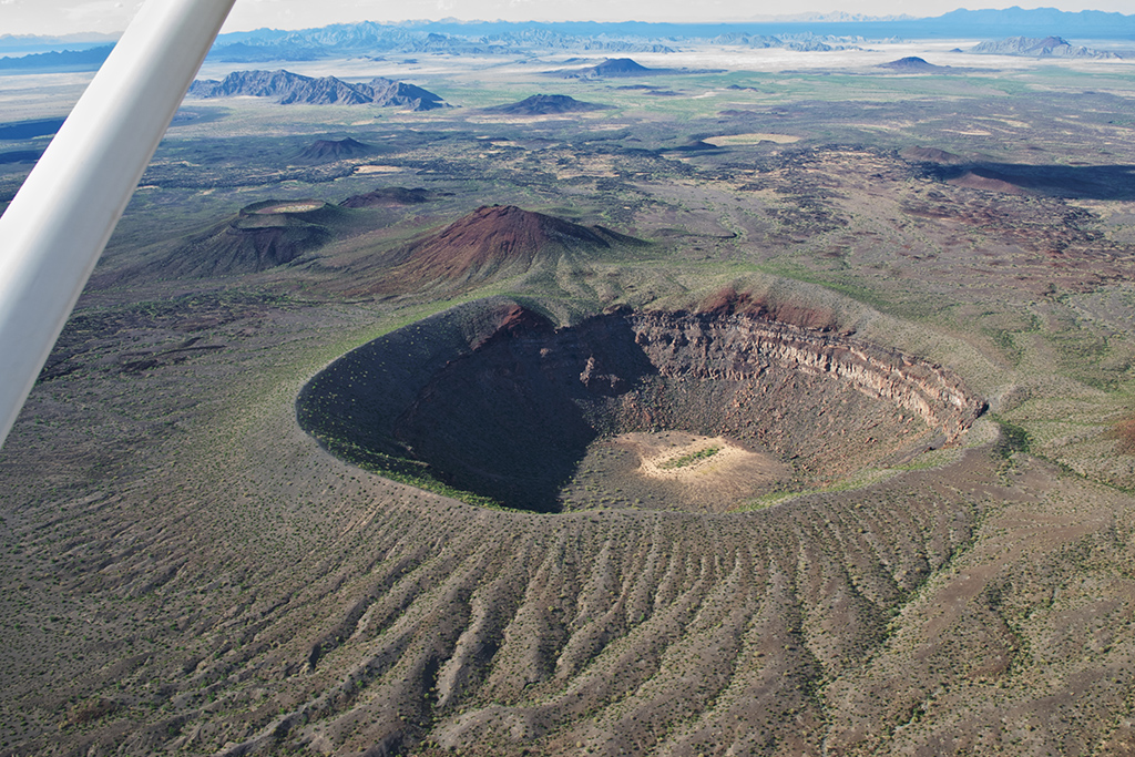Sykes Crater, a. k. a. Crater Grande, is a young maar about 1 km in diameter and 219 m deep. The reddish remnants of a cinder cone are evident in its north-northwestern walls, and an older cinder cone lies just a bit further northwestward. The crater was named in 1908 after Godfrey Sykes, geographer of the 1907 Hornaday expedition.