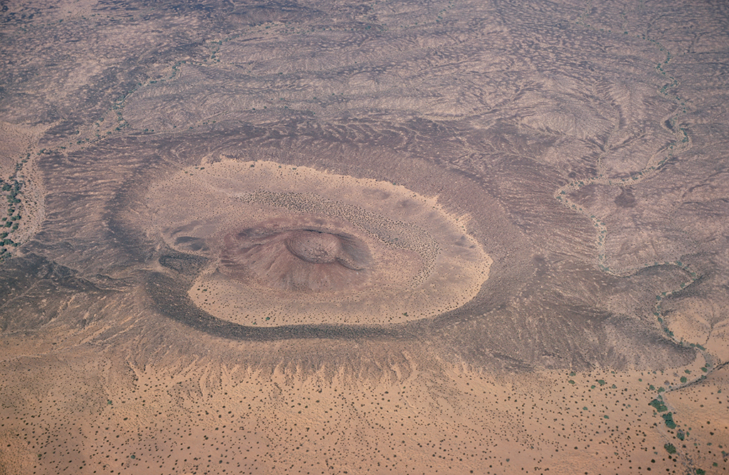 Moon Crater is a maar on the southwestern edge of the exposed Pinacate lavas and is nearly half a kilometer in mean diameter. The supply of groundwater was exhausted during maar-forming eruptions here, and they graded into cinder production that built a small cinder cone in the middle of the crater (Gutmann, 2002).